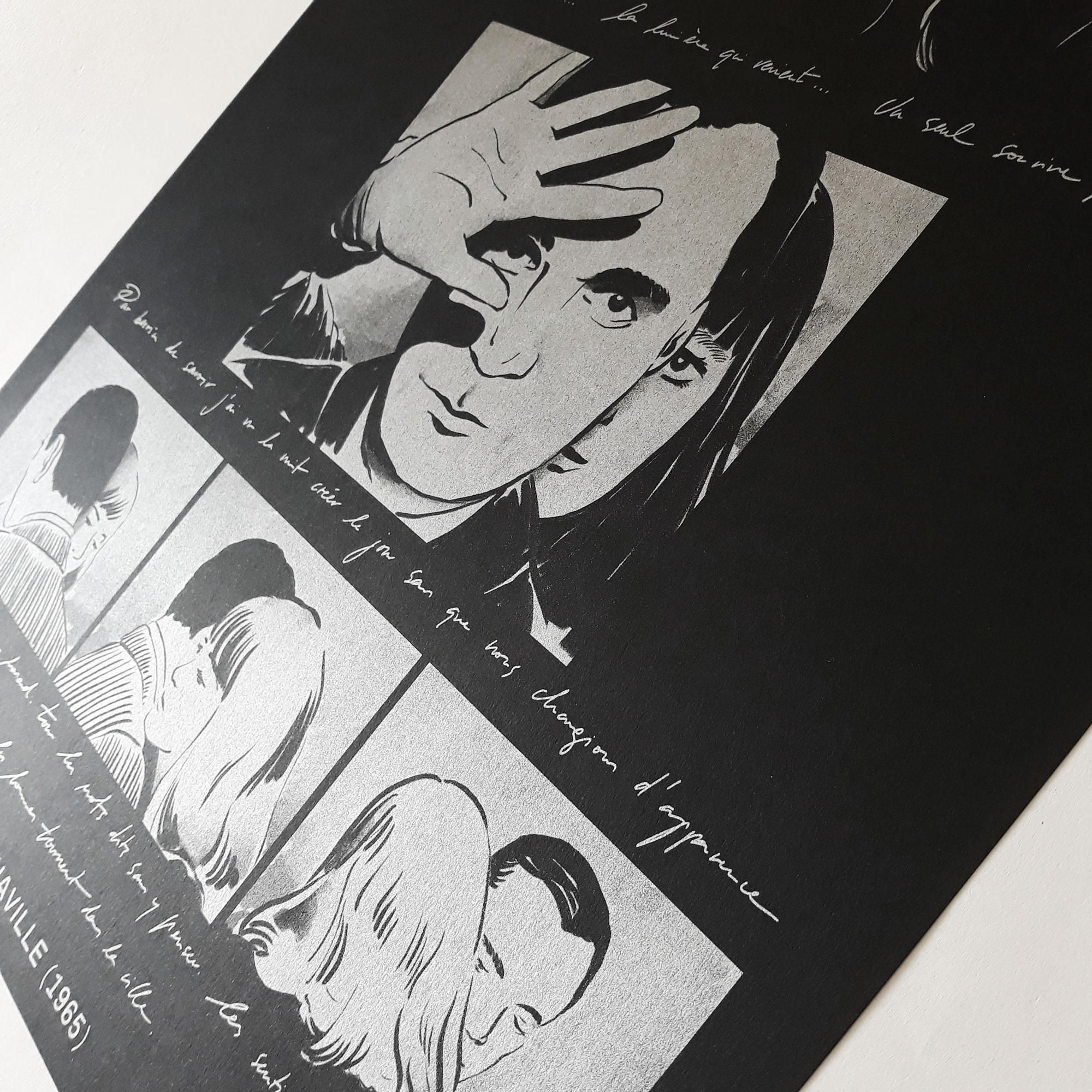 Original art print based on the sequence from Godard’s film “Alphaville”, with Paul Éluard’s poem about love. Limited edition risograph print with silver ink on black paper 185 g / 29,7 x 42 cm (A3) / Edition of 10 copies numbered and signed on the back